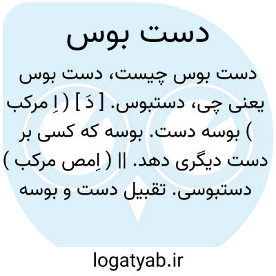دستبوس. [ دَ ] ( اِ مرکب ) بوسه دست. بوسه که کسی بر دست دیگری دهد. || ( اِمص مرکب ) دستبوسی. تقبیل دست و بوسه زدن بر دست. ( ناظم الاطباء ). عمل بوسیدن کسی دست دیگری را: حضرت خلافت را شرم آمد و عاطفت فرمود... و رتبت دست بوس ارزانی داشت. ( تاریخ بیهقی چ ادیب ص 31 ).