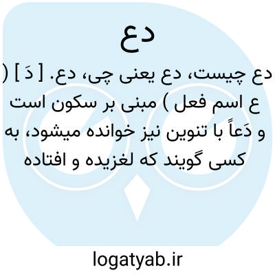 دع. [ دَ ] ( ع اسم فعل ) مبنی بر سکون است و دَعاً با تنوین نیز خوانده میشود، به کسی گویند که لغزیده و افتاده باشد، یعنی برخیز و بمان چنانکه گویند «لعا». ( از منتهی الارب ) ( از اقرب الموارد ). بمان. ( دهار ). و رجوع به دع دع شود. || ( فعل امر ) صیغه امر از «ودع » به معنی بگذار. ( از غیاث ) ( از آنندراج ). بگذار و دست بدار. ( دهار ).