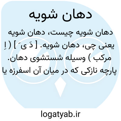دهان شویه. [ دَ ی َ ] ( اِ مرکب ) وسیله شستشوی دهان. پارچه نازکی که در میان آن اسفرزه یا چیزی شبیه به آن ریزند وبر سر آن چوبی تنک بندند و دهان مریض را بدان شویند. ( یادداشت مؤلف ). || داروی جامد یا مایعکه بدان درون دهان پاکیزه کنند. ( یادداشت مؤلف ).