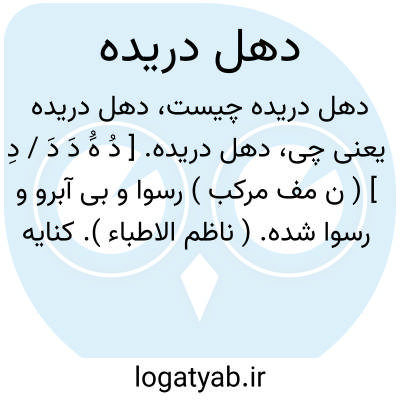 دهل دریده. [ دُ هَُ دَ دَ / دِ ] ( ن مف مرکب ) رسوا و بی آبرو و رسوا شده. ( ناظم الاطباء ). کنایه از رسواست. ( انجمن آرا ) ( آنندراج ). کنایه از رسوا شده باشد. ( برهان ). || خاموش. ( از غیاث ) ( از آنندراج ).