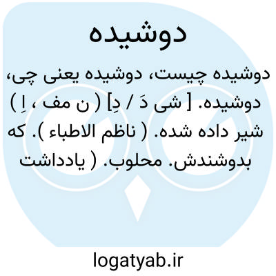 دوشیده. [ شی دَ / دِ] ( ن مف، اِ ) شیر داده شده. ( ناظم الاطباء ). که بدوشندش. محلوب. ( یادداشت مؤلف ): خلیطة؛ دوشیده شدن ناقه بر شیر گوسپند. انشخاب؛ دوشیده شدن شیر. استعتام؛ درشبانگاه دوشیده شدن ناقه. عتم؛ دوشیده شدن شتر وقت عشاء. اعتام؛ دوشیده شدن شتر ماده. ( منتهی الارب ). || شیرده. || زن پستان بزرگ. || توأمان. || جعلی. ( ناظم الاطباء ). || افشرده. ( یادداشت مؤلف ): معصرة؛ جایی که دوشیده انگور نهند. ( لغت نامه مقامات حریری ).