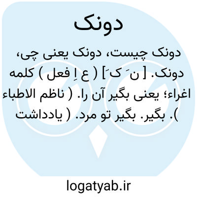 دونک. [ ن َ ک َ] ( ع اِ فعل ) کلمه اغراء؛ یعنی بگیر آن را. ( ناظم الاطباء ). بگیر. بگیر تو مرد. ( یادداشت مؤلف ). || ادن دونک؛ نزدیک شو به من. ( ناظم الاطباء ).