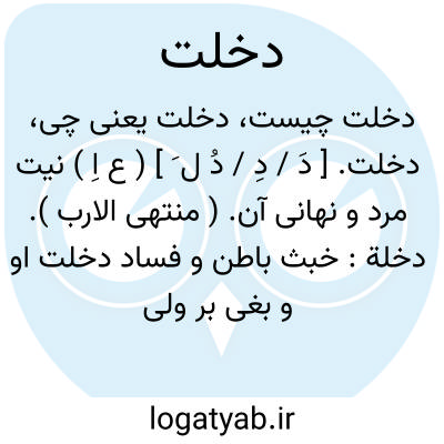 دخلت. [ دَ / دِ / دُ ل َ ] ( ع اِ ) نیت مرد و نهانی آن. ( منتهی الارب ). دخلة: خبث باطن و فساد دخلت او و بغی بر ولی نعمت او را بر آن داشت که آبروی ملک بریخت و خانه قدیم دولت بر باد داد. ( ترجمه تاریخ یمینی ). پوشیده نماند که عاقبت خداع وقصارای مکیدت که از خبث دخلت و فساد نحلت متولد باشد مذموم است. ( جهانگشای جوینی ). رجوع به دخلة شود.