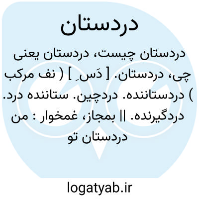 لغت نامه دهخدا دردستان. [ دَس ِ ] ( نف مرکب ) دردستاننده. دردچین. ستاننده درد. دردگیرنده. || بمجاز، غمخوار: من دردستان تو نهانی تو درد دل که می ستانی ؟نظامی.