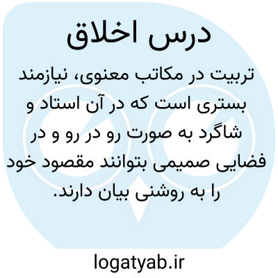 [ویکی فقه] درس اخلاق (ویژگی ها). در نشست ها و آموزش های اخلاقی گفتاری لازم است تا استاد و شاگرد رو در روی یکدیگر قرار گرفته و به سادگی مقصود خود را بیان دارند. اینجاست که درس های گفتاری اخلاق ضرورت یافته و سخن از ویژگی های درس اخلاق مطرح می شود. از این روی در پرتو معارف اسلامی و بهره مندی از تجربه پاکان راه طی کرده، به تبیین برخی از آنها پرداخته و به قدر توان در بررسی آن می کوشیم. باشد که این برترین امتیاز حوزه های علمیه هرچه باشکوه تر و شایسته تر رسالت «خودسازی» را به انجام رساند و مدخل پرواز ملکوتی را به روی سالکان حقیقت و معنویت بگشاید. گران باری، مراعات استعداد و توان دریافتی شاگرد، تنوع و شادابی، پرهیز از القای خرافات و اوهام و رعایت نطم و ترتیب از ویژگی های درس اخلاق است.