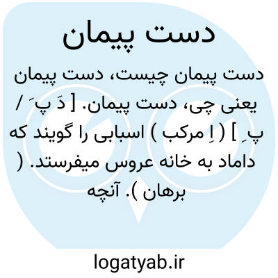 دست پیمان. [ دَ پ َ / پ ِ ] ( اِ مرکب ) اسبابی را گویند که داماد به خانه عروس میفرستد. ( برهان ). آنچه از نقد و جنس و زیور قبل از مزاوجت به عروس دهند و مهر معجل و کابین و اسباب دامادی. ( غیاث ). آنچه از نقد و جنس و زیور قبل از مزاوجت به عروس دهند و در جهانگیری مهر معجل و کابین و در سروری مطلق اسباب داماد، و دست فیمان معرب آن است. ( آنندراج ). شیربها. || مهری را گویند که بوقت عقد کردن قرار دهند و آنرا مهر مؤجل ! خوانند و معرب آن دستفیمان است. ( از برهان ). مهر مؤجل ! ( جهانگیری ). کابین. ( یادداشت مرحوم دهخدا ). سیاق. شبر. صداق. صدقة. ( منتهی الارب ). عقد. ( دهار ). مَهر: