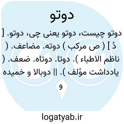 دوتو. [ دُ ] ( ص مرکب ) دوته. مضاعف. ( ناظم الاطباء ). دوتا. دوتاه. ضعف. ( یادداشت مؤلف ). || دوبالا و خمیده و منحنی و دوتا. ( از آنندراج ). دوتاه. دوته. خم. خم شده: و در میان کتفهای او بالشی دوتو اندر نهند. ( ذخیره خوارزمشاهی ).