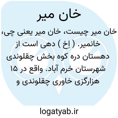 خانمیر. ( اِخ ) دهی است از دهستان دره کوه بخش چقلوندی شهرستان خرم آباد. واقع در 15 هزارگزی خاوری چقلوندی و ششهزار گزی جنوب راه شوسه خرم آباد به چقلوندی. ناحیه ای است کوهستانی و سردسیر و مالاریایی. دارای 120 تن سکنه که شیعی مذهب و لکی و لری و فارسی زبانند. این ده از چشمه ده تپه دارتوت مشروب میشود. محصولاتش غلات و صیفی و لبنیات است و اهالی به کشاورزی و گله داری گذران میکنند. از صنایع دستی زنان فرش و سیاه چادر بافی است، راه مالرو و ساکنین از طایفه بیرالوند بوده و زمستان به قشلاق میروند. ( از فرهنگ جغرافیایی ایران ج 6 ).