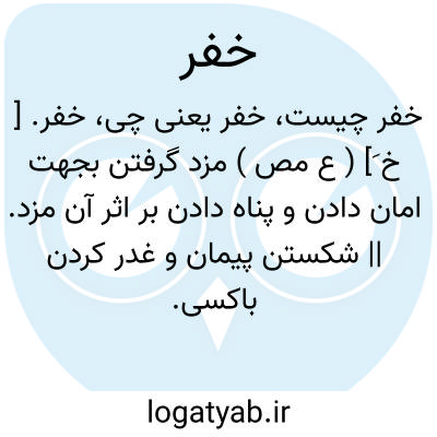 خفر. [ خ َ] ( ع مص ) مزد گرفتن بجهت امان دادن و پناه دادن بر اثر آن مزد. || شکستن پیمان و غدر کردن باکسی. خُفور. خَفور، منه: خفر به خفوراً ( بفتح و ضم خاء ). || وفا کردن بعهد خود، منه: خفر بعهده خفراً. || نگاهبان و بدرقه شدن و نگاهداری کردن. ( منتهی الارب ) ( از تاج العروس ) ( از لسان العرب ) ( از اقرب الموارد ).