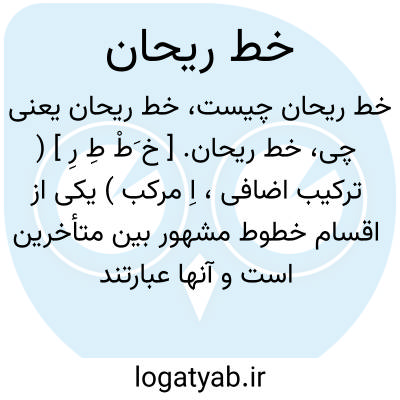 خط ریحان. [ خ َطْ طِ رِ ] ( ترکیب اضافی، اِ مرکب ) یکی از اقسام خطوط مشهور بین متأخرین است و آنها عبارتند از: ثلث، نسخ، تعلیق، ریحان، محقق، رقاع، نستعلیق و دیوانی. ( از کشف الظنون در عنوان «علم الخط» ). آنرا خط جلی نیز می گویند. ( از ناظم الاطباء ). در این خط در عوض حروفش اقسام گلها نگاهدارندو آنرا خط گلزار گویند. ( غیاث اللغات ):