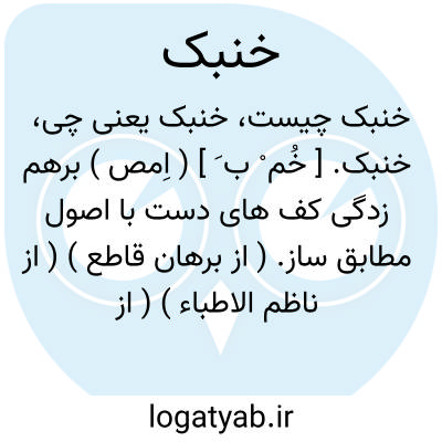 خنبک. [ خُم ْ ب َ ] ( اِمص ) برهم زدگی کف های دست با اصول مطابق ساز. ( از برهان قاطع ) ( از ناظم الاطباء ) ( از انجمن آرای ناصری ). || استهزاء. مسخره. ( ناظم الاطباء ). || ( اِ ) جامه درشت و خشن که درویشان پوشند. ( برهان قاطع ) ( از ناظم الاطباء ) ( از انجمن آرای ناصری ). || تنبک. دمبک. ( از ناظم الاطباء ) ( از انجمن آرای ناصری ) ( از آنندراج ). || خمره کوچک. ( ناظم الاطباء ). خمچه. خنبچه. خم کوچک. ( یادداشت بخط مؤلف ). || کنار طبل. || نفیر اسب در هنگام نوشیدن آب. ( ناظم الاطباء ).