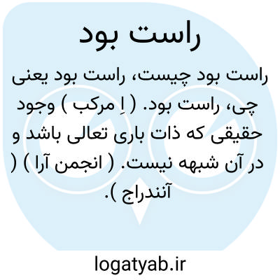 راست بود. ( اِ مرکب ) وجود حقیقی که ذات باری تعالی باشد و در آن شبهه نیست. ( انجمن آرا ) ( آنندراج ). ذات باری تعالی و واجب الوجود. ( ناظم الاطباء ). موجود حقیقی را گویند که ذات باری تعالی باشد جل جلاله. ( برهان ). این کلمه از لغات دساتیری است. ( از حاشیه برهان قاطع چ معین ). رجوع به فرهنگ دساتیر ص 246 شود.