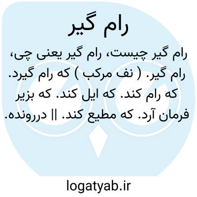 رام گیر. ( نف مرکب ) که رام گیرد. که رام کند. که ایل کند. که بزیر فرمان آرد. که مطیع کند. || دررونده. فرارکننده. دورشونده. ( از اشتنگاس ). || گریختن. ( آنندراج ). چنین است بمعنی مصدری ! گریز و فرار. ( ناظم الاطباء ). اما ظاهراًمنقولات فرهنگ ناظم الاطباء و آنندراج و اشتنگاس بر اساسی نباشد چه، جای دیگر باین معنی دیده نشده است.