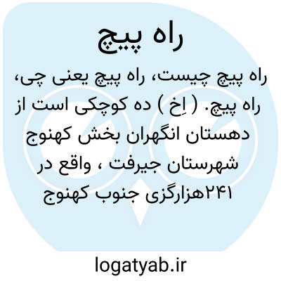 راه پیچ. ( اِخ ) ده کوچکی است از دهستان انگهران بخش کهنوج شهرستان جیرفت، واقع در 241هزارگزی جنوب کهنوج و3هزارگزی باختری راه مالرو انگهران، جاسک. مردم این ده 25 تن میباشد. ( از فرهنگ جغرافیایی ایران ج 8 ).