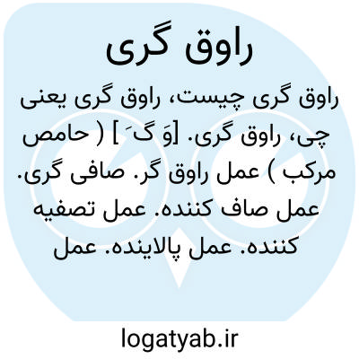 راوق گری. [وَ گ َ ] ( حامص مرکب ) عمل راوق گر. صافی گری. عمل صاف کننده. عمل تصفیه کننده. عمل پالاینده. عمل پالایشگر. داروسازی. || عمل تصفیه. پالایش: