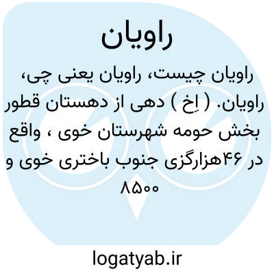 راویان. ( اِخ ) دهی از دهستان قطور بخش حومه شهرستان خوی، واقع در 46هزارگزی جنوب باختری خوی و 8500 گزی جنوب راه ارابه رو قطور بخوی. این ده در دره واقع شده و هوای آن سردسیر و سالم و سکنه آن 166 تن است. آب راویان از چشمه تأمین میشود و محصول عمده آن غلات است. پیشه مردم کشاورزی و دامپروری است. این ده در 5هزارگزی مرز ترکیه قرار گرفته و محل سکونت ایل شکاک است. ( از فرهنگ جغرافیایی ایران ج 4 ).