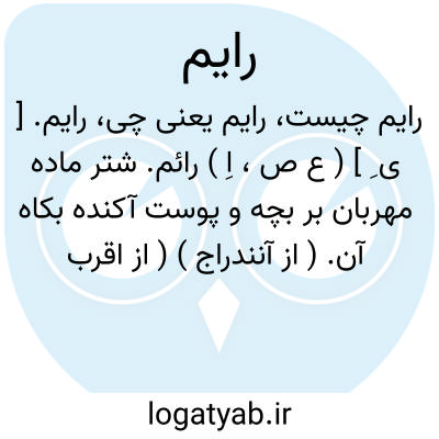 رایم. [ ی ِ ] ( ع ص، اِ ) رائم. شتر ماده مهربان بر بچه و پوست آکنده بکاه آن. ( از آنندراج ) ( از اقرب الموارد ) ( از منتهی الارب ) ( از المنجد ) ( ناظم الاطباء ). || اشتر که بر بچه دیگری آموخته بود. ( مهذب الاسماء ).