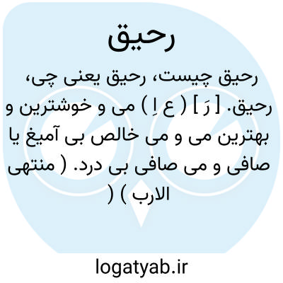 رحیق. [ رَ ] ( ع اِ ) می و خوشترین و بهترین می و می خالص بی آمیغ یا صافی و می صافی بی درد. ( منتهی الارب ) ( ناظم الاطباء ). شراب خالص و صاف. ( غیاث اللغات ) ( فرهنگ سروری ). شراب ویژه. ( مهذب الاسماء ). شراب خالص و صاف و خوشبوی. ( آنندراج ). شراب نیکو یا خالص بی آمیغ یا صافی بی درد. ( جهانگیری ). شراب خالص. ( دهار ) ( ترجمان القرآن ص 51 ). شراب ناب خالص صافی کهنه بی غش. ( یادداشت مؤلف ). می. ( از اقرب الموارد ):