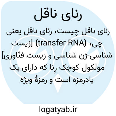 {transfer RNA} [زیست شناسی-ژن شناسی و زیست فنّاوری] مولکول کوچک رِن‍ا که دارای یک پادرمزه است و رمزۀ ویژه ای را در رِنای پیک شناسایی می کند و از یک انتها با اتصال به یک آمینواسید خاص آن را به زنجیرۀ پلی پپتیدی درحال ساخت اضافه می کند اختـ. رِنان tRNA