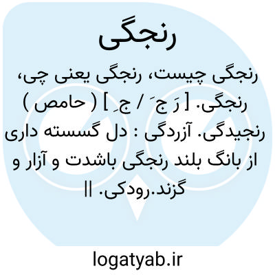 رنجگی. [ رَ ج َ / ج ِ ] ( حامص ) رنجیدگی. آزردگی: