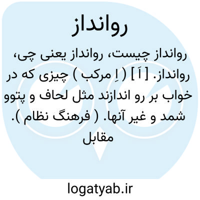 روانداز. [ اَ ] ( اِ مرکب ) چیزی که در خواب بر رو اندازند مثل لحاف و پتوو شمد و غیر آنها. ( فرهنگ نظام ). مقابل زیرانداز.