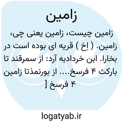 زامین. ( اِخ ) قریه ای بوده است در بخارا. ابن خردادبه آرد: از سمرقند تا بارکث 4 فرسخ.... از بورنمذتا زامین 4 فرسخ [ بیابان ] است و در اینجا دو راه یکی به شاش ( چاچ ) و ترک و دیگری به فرغانه میرود... و از زامین تا ساباط دو فرسخ است. ( از مسالک الممالک ص 26، 27 و 29 ). یاقوت آرد: قریه ای است در بخارا و ابوسعد گوید شهری کوچک است در نواحی سمرقند از اعمال اشروسنه و گاه بهنگام منسوب ساختن زامینجی گویند ( با اضافه ج ). و اصطخری گوید: بزرگترین شهرهای اشروسنه بجیکث است و تالی آن دربزرگی زامین است که در راه فرغانه به صغد قرار دارد. زامین سبزه نیز نامیده میشود. و قافله هائی که از صغد به فرغانه میروند، در آنجا منزل میکنند و دارای آبهای روان و بستانها و موستان است. پشت کوههای اشروسنه و روبروی آن تا بلاد غربی بیابانی است که کوه ندارد. و جماعتی از اهل علم منسوب به زامین اند. فاصله آن تا ساباط دو فرسخ است و تا اشروسنه 7 فرسخ است. و ابن فقیه گوید: از سمرقند تا زامین 17 فرسخ و زامین در مقطع دو راه که به شاش و ترک و فرغانه میرود واقعاست و فاصله آن تا شاش 25 فرسخ و از شاش تا معدن نقره 7 فرسخ و تا باب الحدید ( دروازه آهن ) 2 میل است.( از معجم البلدان ). و رجوع به ص 203، 204 و 207 از مسالک الممالک ابن خردادبه و زامیج و زامینجی شود.