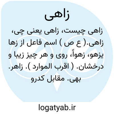 زاهی.( ع ص ) اسم فاعل از زها یزهو، زهواً، روی و هر چیز زیبا و درخشان. ( اقرب الموارد ). زاهر. بهی. مقابل کدرو تیره. ( القاموس العصری، عربی - انگلیسی ). آنچه میدرخشد و چشم را از دیدن آن خوش می آید. || خرمابن که میوه آن رنگ گرفته باشد. || شتری که حمض و شوره گیاه را چرا نکند. ( ناظم الاطباء ).