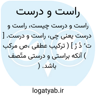 راست و درست. [ ت ُ دُ رُ ] ( ترکیب عطفی،ص مرکب ) آنکه براستی و درستی متّصف باشد. ( یادداشت مؤلف ): آدم راست و درستی است. تسدید؛ راست و درست نمودن. ( آنندراج ). راست و درست کردن. ( منتهی الارب ).