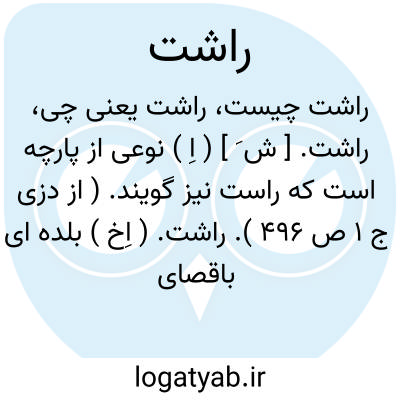 راشت. [ ش َ ] ( اِ ) نوعی از پارچه است که راست نیز گویند. ( از دزی ج 1 ص 496 ).