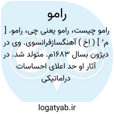 رامو. [ م ُ ] ( اِخ ) آهنگسازفرانسوی. وی در دیژون بسال 1683م. متولد شد. در آثار او حد اعلای احساسات دراماتیکی دیده میشود و خود از بزرگترین موسیقیدانان فرانسه بشمار میرفت. مرگ رامو بسال 1764 م. روی داد.