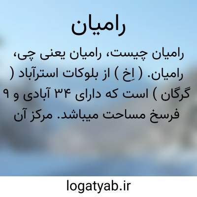 رامیان. ( اِخ ) از بلوکات استرآباد ( گرگان ) است که دارای 34 آبادی و 9 فرسخ مساحت میباشد. مرکز آن رامیان و حدود آن بشرح زیر است: از شمال به صحرای ترکمن و حاجی لر، از جنوب بکوهستان شاهرود و بسطام و از خاور به فندرسک محدود است. جمعیت تقریبی بلوک 8445تن میباشد. ( از جغرافیای سیاسی کیهان ص 310 ). دیه های رامیان عبارتند از: گل چشمه ( سابقاً دره ویه نامیده میشده ) اسپرنجان، جوزچال، کبودچشمه، خاندوز، کومیان،لیرو، میرمحله، نرگس چال، نوده اسماعیل خان «118» ( نوده میر سعداﷲخان ) ( نوده علی نقی خان )، پاقلعه، پلرم رامیان ( در ناحیه ای که محصور بدو تپه مستور از جنگل است بنام کوه خوش ییلاق )، زری، سیدکلا، سوخته سرا، توران، وطن. کوههای رامیان عبارتند از: آسمیان که قلعه پوران درآنجاست، نیلاکوه در جنوب چکور. در میان ایندو محلی است که تپه تخت رستم در آنجاست؛ این کوه گاهی ماران کوه و ایلان کوه خوانده میشود. قلعه ماران، در میان چمنزاری واقع است و راه باریکی که بآنجا منتهی میشود در مقابل مهاجمان به آسانی قابل دفاع است. ( از ترجمه سفرنامه مازندان و استرآباد رابینو ص 171 ).