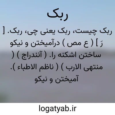 ربک. [ رَ ] ( ع مص ) درآمیختن و نیکو ساختن اشکنه را. ( آنندراج ) ( منتهی الارب ) ( ناظم الاطباء ). آمیختن و نیکو گردیدن ثرید. ( تاج المصادر بیهقی ) ( از اقرب الموارد ). آمیختن. ( مصادراللغة زوزنی ). || انداختن کسی را در گل و لای. ( آنندراج ) ( ناظم الاطباء ) ( منتهی الارب ) ( از اقرب الموارد ). || ربیکه ساختن. ( منتهی الارب ) ( مصادراللغة زوزنی ) ( ازاقرب الموارد ) ( ناظم الاطباء ). ربیکه ساختن و آن طعامی است که از خرما و روغن و ماست سازند. ( آنندراج ). طعامی ساختن از خرما و روغن. ( تاج المصادر بیهقی ).
