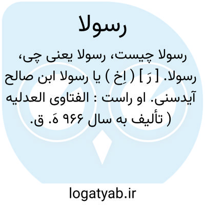 رسولا. [ رَ ] ( اِخ ) یا رسولا ابن احمدبن یوسف حنفی تبانی، ملقب به جلال الدین. او راست: 1- تعلیقه بر موصل حسین بن علی بن علی صنعانی که موفق به اتمام آن نشده. 2- شرح مفیدی بر منارالانوار نسفی. 3- حاشیه ای بر ایضاح ابن حاجب. 4- تعلیقه ای بر اصول علی بن محمدبن بزدودی. 5- رسالة فی زیادة الایمان و نقصانه. 6- رسالة فی الفرق بین القرض العملی و الواجب. 7- منظومة فی الفروع. 8- شرح منظومه اخیر در چهار جلد. 9- رد رساله محمدبن محمود بابرتی. 10- رد رسالة فی الجمعة و عدم جواز الصلوة فی مواضع متعدده. 11- مختصر شرح مغلطای بر صحیح بخاری. 12- شرح تلخیص المفتاح. 13- رسالة فی البسملة. رسولا به سال 793 هَ. ق. درگذشت. ( یادداشت مؤلف ).، رسول ا. [ رَ لُل ْ لاه ْ / ل َه ْ ] ( ع اِ مرکب ) فرستاده خدا. پیامبر خدا. || ( اِخ ) کنایه از حضرت محمد ( ص ). ( یادداشت مؤلف ):