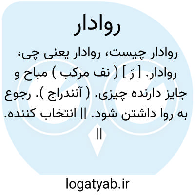 روادار. [ رَ ] ( نف مرکب ) مباح و جایز دارنده چیزی. ( آنندراج ). رجوع به روا داشتن شود. || انتخاب کننده. || تحسین کننده. رجوع به روا داشتن شود. || قبول کننده و راضی. || ( ن مف مرکب ) مشروع و درست و صحیح. || مناسب و شایسته و سزاوار. || ( اِ مرکب ) حق قضاوت. ( ناظم الاطباء ).