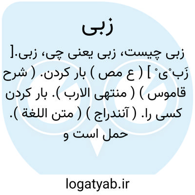 زبی.[ زَب ْی ْ ] ( ع مص ) بار کردن. ( شرح قاموس ) ( منتهی الارب ). بار کردن کسی را. ( آنندراج ) ( متن اللغة ). حمل است و جوهری این شعر را بگواه آورده است: