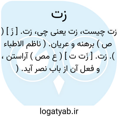 زت. [ زَت ت ] ( ع مص ) آراستن، و فعل آن از باب نصر آید. ( شرح قاموس ) ( ناظم الاطباء ) ( ازمنتهی الارب ). آراستن. ( آنندراج ). تزیین. ( از قطر المحیط ) ( از اقرب الموارد ) ( از متن اللغة ) ( از قاموس ) ( از المعجم الوسیط ). زت و تزئیت، آراستن است، و فعل ثلاثی مجرد از آن بکار نرفته است. ( از تاج العروس ).