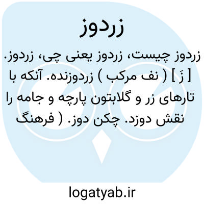 زردوز. [ زَ ] ( نف مرکب ) زردوزنده. آنکه با تارهای زر و گلابتون پارچه و جامه را نقش دوزد. چکن دوز. ( فرهنگ فارسی معین ). چکن دوز. و کسی که با تارهای زر و گلابتون پارچه و جامه را منقش می دوزد. ( ناظم الاطباء ). مخفی نماند که امثال این ترکیب برای دو معنی مستعمل میشود، مثلاً اگر بگوئی مرد زردوز، بمعنی دوزنده زر باشد... ( از آنندراج ):