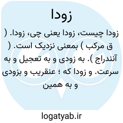 زودا. ( ق مرکب ) بمعنی نزدیک است. ( آنندراج ). به زودی و به تعجیل و به سرعت. و زودا که؛ عنقریب و بزودی و به همین زودی و هرچه زودتر. ( ناظم الاطباء ). بسی زود. چه بسیار زود. ( یادداشت بخط مرحوم دهخدا ):