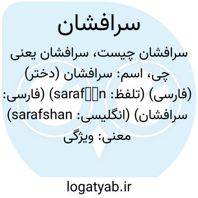 اسم: سرافشان (دختر) (فارسی) (تلفظ: sarafšān) (فارسی: سرافشان) (انگلیسی: sarafshan) معنی: ویژگی کسی که سر می دهد و فداکاری می کند، ( در قدیم ) جنباننده ی سر از ناز و کرشمه و یا از کبر و غرور