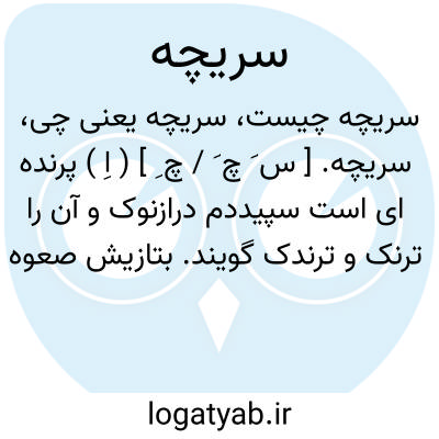 سریچه. [ س َ چ َ / چ ِ ] ( اِ ) پرنده ای است سپیددم درازنوک و آن را ترنک و ترندک گویند. بتازیش صعوه و هند مموله نامند. ( شرفنامه منیری ). نام جانوری است پرنده و کوچک جثه و درازدم که بیشتر بر کناره های آب باشند و دم جنباند و آن را مرغ فاطمه خوانند و به عربی صعوه گویند. ( برهان ). مرغی است و در تحفه آمده مرغ سقا است و بخای معجمه آمده و این بیت را شاهدآورده. سریچه مرغ سقا بود. دقیقی گوید: