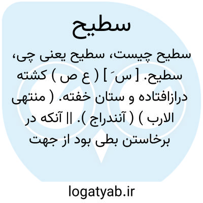 سطیح. [ س َ ] ( ع ص ) کشته درازافتاده و ستان خفته. ( منتهی الارب ) ( آنندراج ). || آنکه در برخاستن بطی بود از جهت ضعف و برجاماندگی. || ( اِ ) توشه دان که از چرم ساخته باشند. ( منتهی الارب ) ( آنندراج ). || بامداد. ( مهذب الاسماء ).