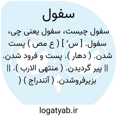 سفول. [ س ُ ] ( ع مص ) پست شدن. ( دهار ). پست و فرود شدن. || پیر گردیدن. ( منتهی الارب ). || بزیرفروشدن. ( آنندراج ) ( غیاث ) ( ترجمان القرآن ترتیب عادل بن علی ص 158 ). از اعلا به نشیب آمدن. فرو شدن. || کم قدر شدن. ( منتهی الارب ). || ( اِمص ) پستی. ( آنندراج ) ( غیاث ) ( منتهی الارب ):