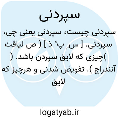 سپردنی. [ س ِ پ ُ دَ ] ( ص لیاقت )چیزی که لایق سپردن باشد. ( آنندراج ). تفویض شدنی و هرچیز که لایق امانت باشد. ( ناظم الاطباء ):