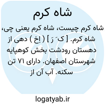 شاه کرم. [ ک َ رَ ] ( اِخ ) دهی از دهستان رودشت بخش کوهپایه شهرستان اصفهان. دارای 71 تن سکنه. آب آن از زاینده رود. محصول آن غلات است. ( از فرهنگ جغرافیایی ایران ج 10 ).