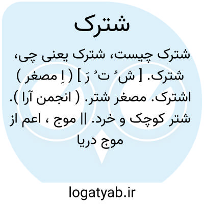 شترک. [ ش ُ ت ُ رَ ] ( اِ مصغر ) اشترک. مصغر شتر. ( انجمن آرا ). شتر کوچک و خرد. || موج، اعم از موج دریا و غیره. ( برهان ). موج باشد و آن را اشترک نیز گویند. ( فرهنگ جهانگیری ). موج. ( انجمن آرا ) ( آنندراج ). موج باشد و آن را اشترک نیز گویند. ( فرهنگ نظام ). خیزآب. کوهه آب. || آدمی را گویند که خود را به صورت شتر و گوسفند و گاو و مانند آن بسازد. ( از برهان ). و رجوع به اشترک شود.