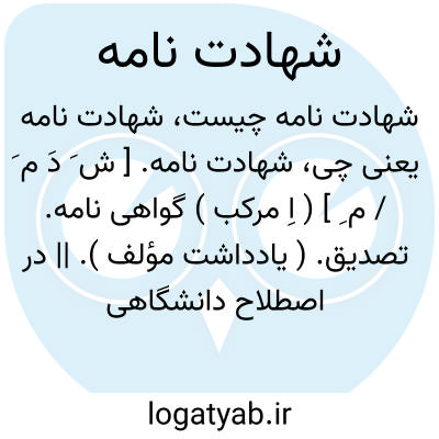 شهادت نامه. [ ش َ دَ م َ / م ِ ] ( اِ مرکب ) گواهی نامه. تصدیق. ( یادداشت مؤلف ). || در اصطلاح دانشگاهی، تصدیق نامه ای دائر به گذراندن ماده ای از دروس یا واحدی از دروس و قبول شدن در امتحان آن ماده یا واحد درس. دیپلم.