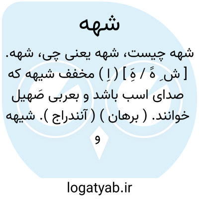 شهه. [ ش ِ هََ / هَِ ] ( اِ ) مخفف شیهه که صدای اسب باشد و بعربی صَهیل خوانند. ( برهان ) ( آنندراج ). شیهه و صدای اسب. ( ناظم الاطباء ). رجوع به شیهه شود.