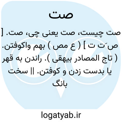 صت. [ ص َت ت ] ( ع مص ) بهم واکوفتن. ( تاج المصادر بیهقی ). راندن به قهر یا بدست زدن و کوفتن. || سخت بانگ کردن. || تهمت کردن کسی را بداهیة یا بسخن. || ( اِ ) گروه مردم. و منه الحدیث: قاموا صتین؛ ای جماعتین، و یروی صتیین. || بانگ سخت. ( منتهی الارب ).