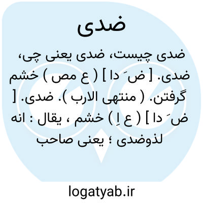ضدی. [ ض َ دا ] ( ع اِ ) خشم، یقال: انه لذوضدی؛ یعنی صاحب غضب است. ( منتهی الارب ).