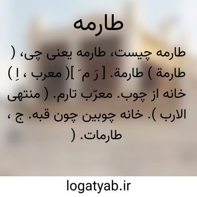 ( طارمة ) طارمة. [ رَ م َ ]( معرب، اِ ) خانه از چوب. معرّب تارم. ( منتهی الارب ). خانه چوبین چون قبه. ج، طارمات. ( دستوراللغه ادیب نطنزی ). بیت من خشب. فارسی معرب، نقله الجوهری، و زاد الازهری: کالقبة. ( تاج العروس ). خانه از چوب چون گنبدی. ( زمخشری ). || هر بناء گرد. ( زمخشری ). || خرگاه. ج، طوارم. ( مهذب الاسماء ).
